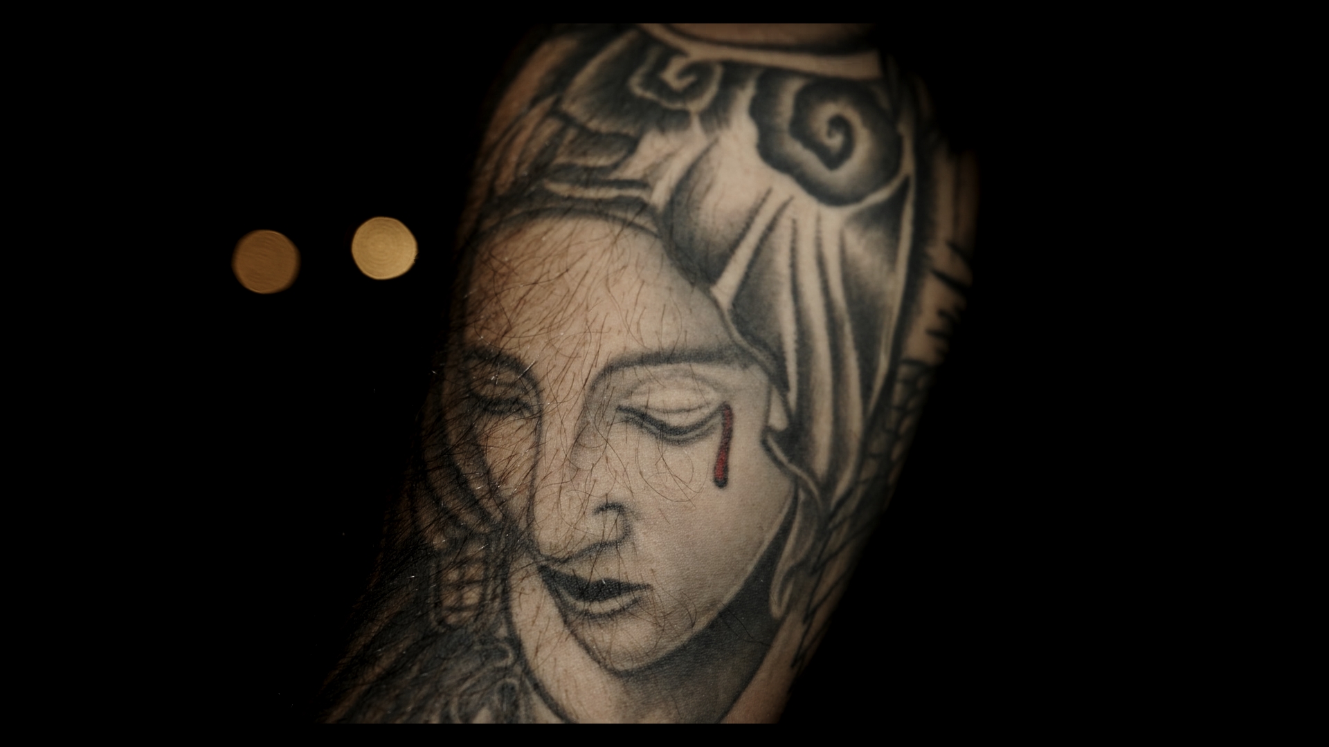The tattoos represent fragments of many of those lives. There are families who are gone, entire neighborhoods that were demolished, knives, pistols, crying eyes, hands gripping bars, handcuffs, a judge’s gavel, a machine gun, a blade, a joint, a broken heart, a bird flying toward freedom, and the words “God forgives but I don’t” tattooed on skin.